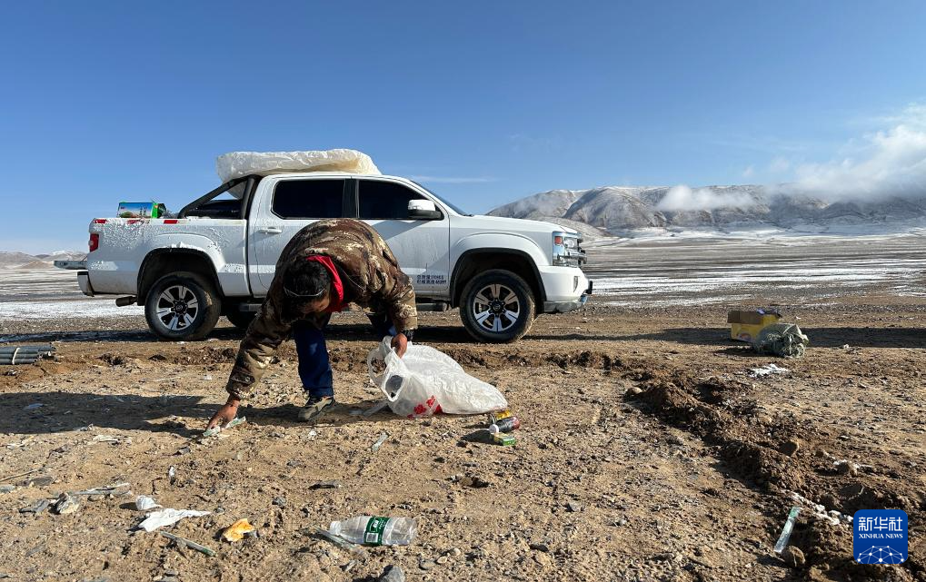 6月15日,格桑倫珠在撿拾宿營地的垃圾,準(zhǔn)備裝車帶走。新華社記者 費茂華 攝