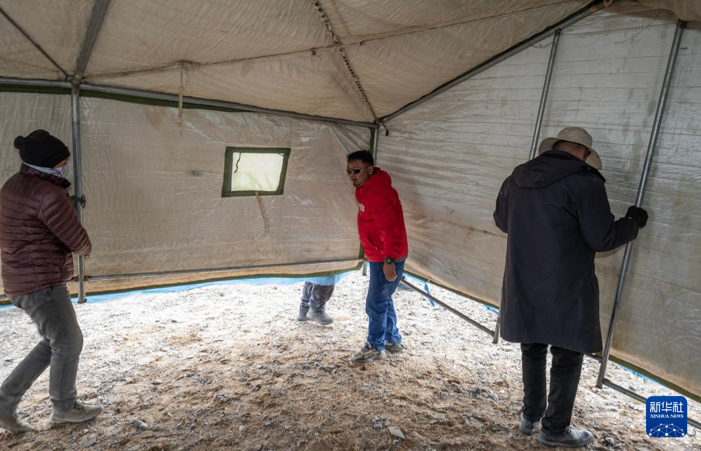 6月13日,格桑倫珠(中)、管護(hù)隊員和記者一起搭帳篷。新華社記者 費茂華 攝