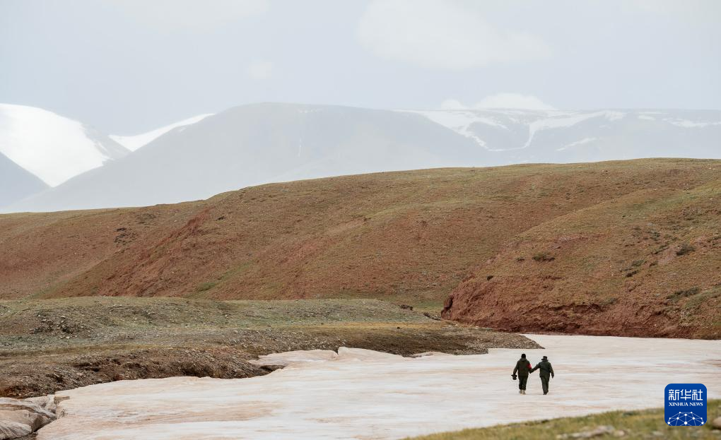 6月15日,羌塘國家級自然保護(hù)區(qū)野生動物專業(yè)管護(hù)隊員索朗(右)和羅布檢查河面冰凍情況。新華社記者 費茂華 攝