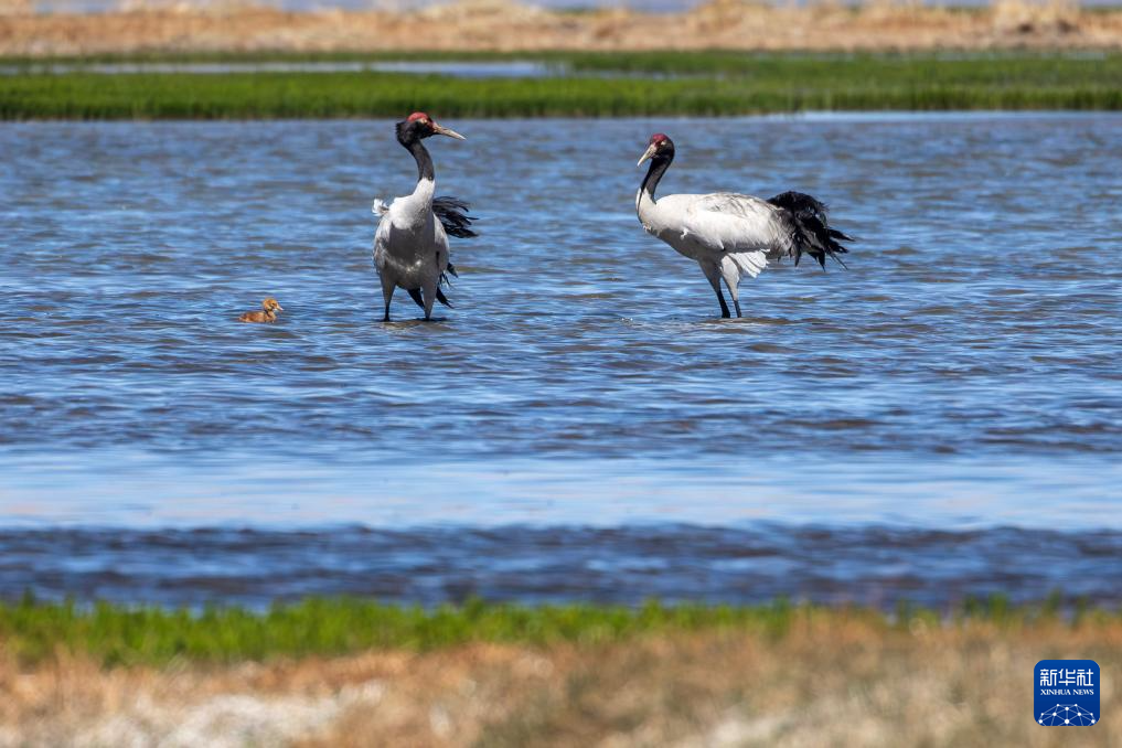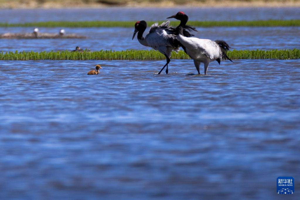 這是在那曲市申扎縣拍攝的養(yǎng)育雛鳥的黑頸鶴(6月9日攝)。新華社記者 姜帆 攝