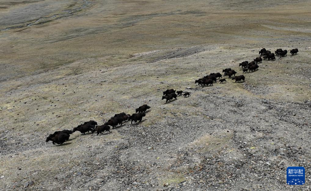 這是在那曲市尼瑪縣拍攝的野牦牛群,其中有剛出生不久的小牛犢(無人機(jī)照片,6月15日攝)。新華社記者 晉美多吉 攝
