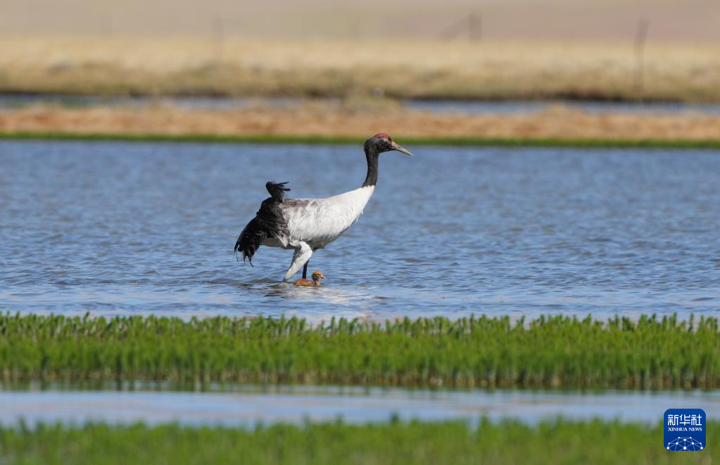 這是在那曲市申扎縣拍攝的養(yǎng)育雛鳥的黑頸鶴(6月9日攝)。新華社記者 旦增尼瑪曲珠 攝