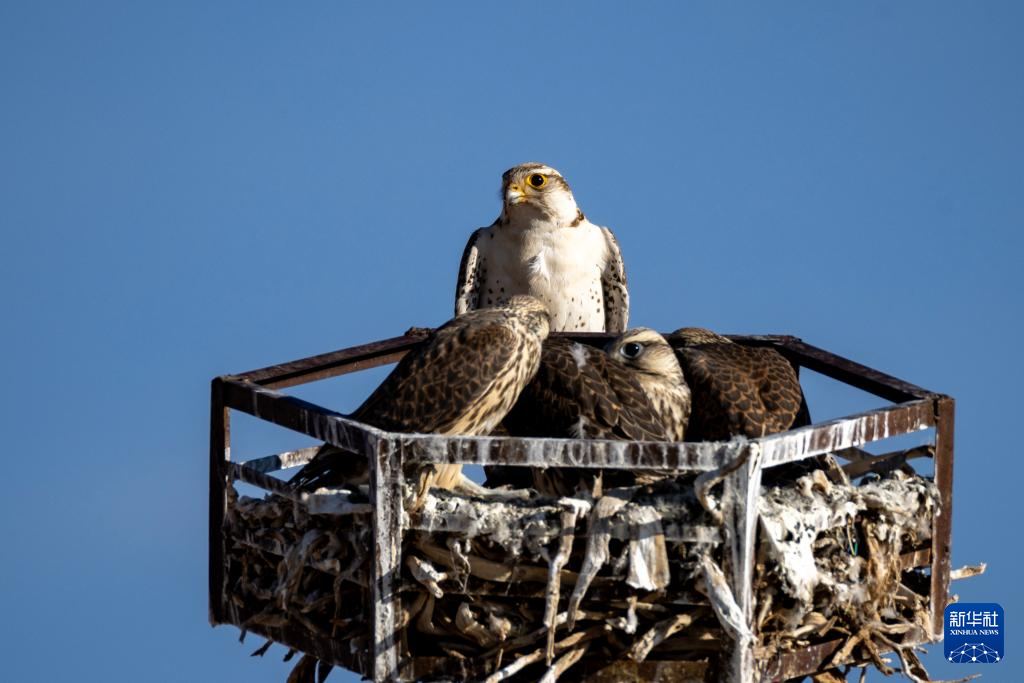 這是在那曲市尼瑪縣拍攝的養(yǎng)育雛鳥的游隼,它們在“無人區(qū)”中林草部門樹立的“鷹架”上營巢(6月13日攝)。新華社記者 姜帆 攝