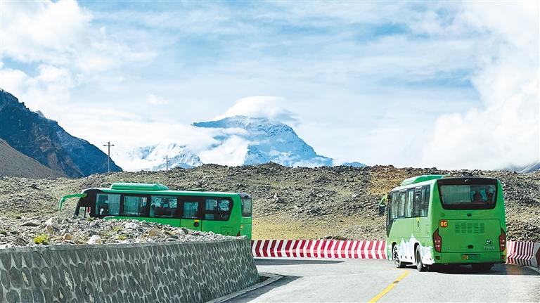 圖為載滿游客的清潔能源環(huán)保客車前往珠峰大本營。記者 格桑倫珠 攝