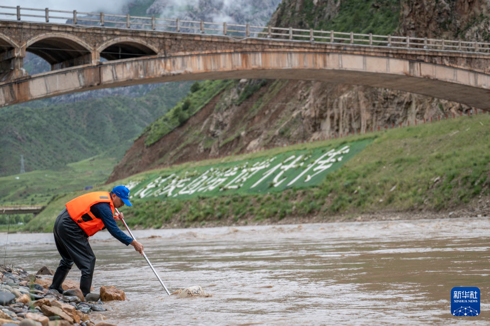 7月21日,在囊謙香達(dá)河段,科考隊(duì)員在進(jìn)行底棲生物監(jiān)測采樣。新華社記者 伍志尊 攝