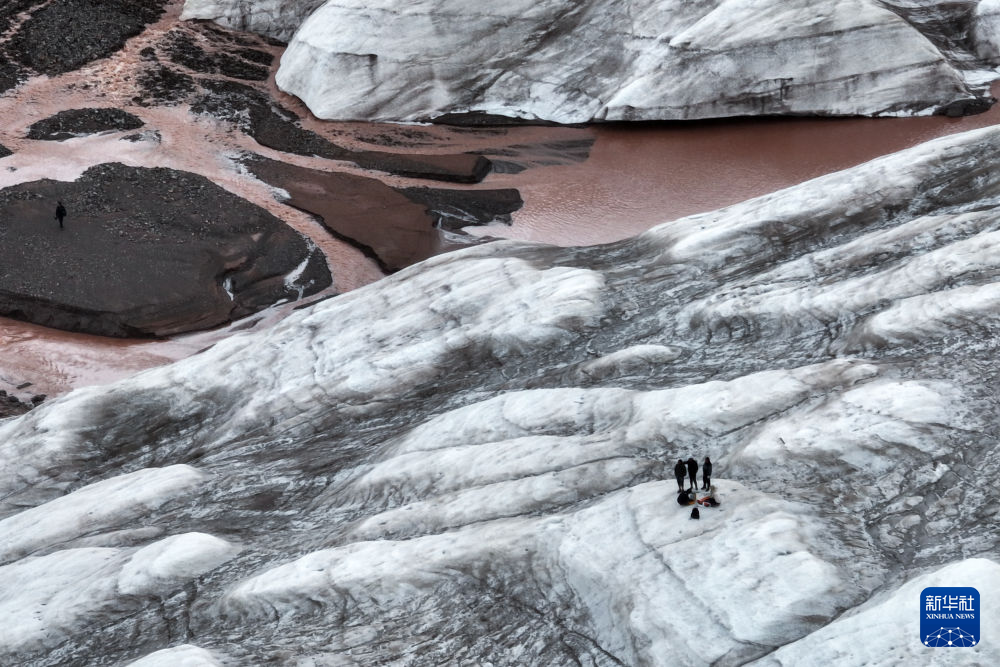 7月25日,在冬克瑪?shù)妆?,科考?duì)員在探測冰川(無人機(jī)照片)。新華社記者 伍志尊 攝