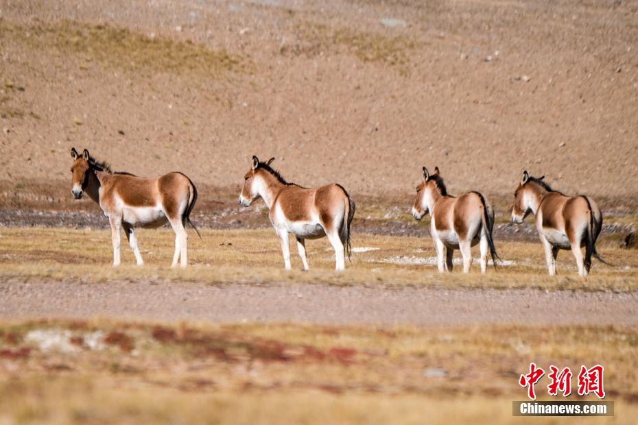 西藏羌塘草原位于昆侖山脈、唐古拉山脈和岡底斯山脈之間,是野生動植物的天堂。近日,中新社記者探訪西藏羌塘草原腹地那曲市雙湖縣,看到當?shù)夭亓缪?、藏野驢、藏原羚等野生動物成群覓食,悠然自得。圖為10月3日,羌塘草原上的一群藏野驢悠閑覓食。