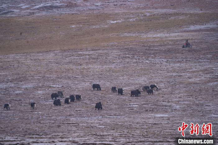 10月23日,西藏自治區(qū)那曲市安多縣多瑪鄉(xiāng)牧民在雪中放牧。當日,一場雪將藏北草原裝扮得如詩如畫。牧民們在這銀裝素裹的天地間,開始了雪中放牧的生活。牛羊在雪地中悠閑覓食,牧民駕駛著摩托車,在雪中放牧,形成了一幅動人的風景畫。圖為牦牛在草原上覓食。中新社記者 貢嘎來松 攝