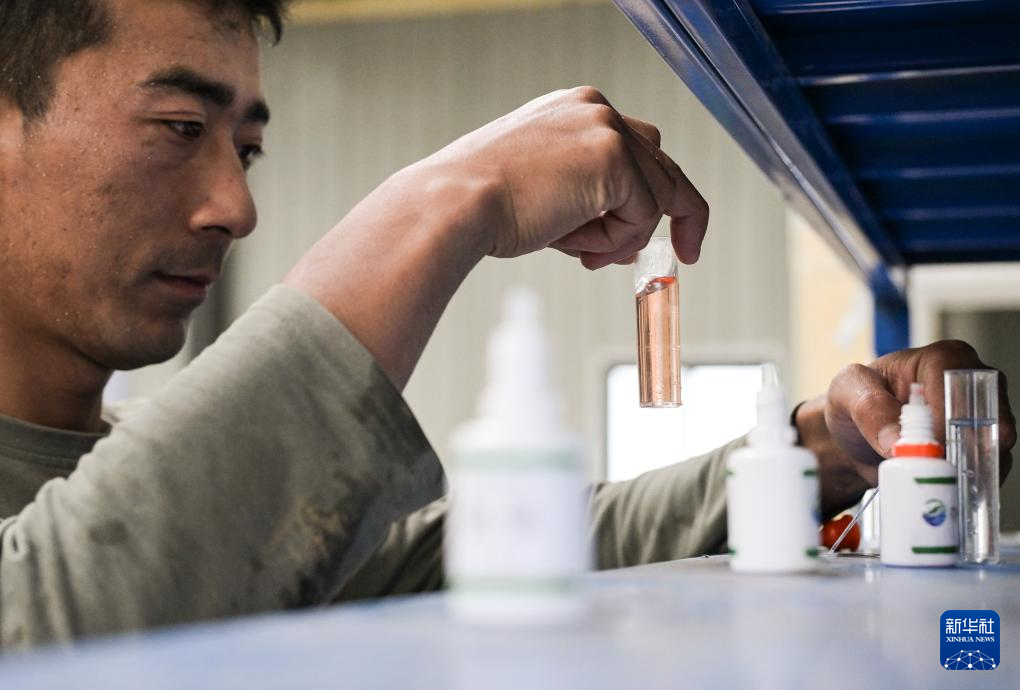 在西藏林芝市米林農(nóng)場(chǎng)的粵林高原漁業(yè)科技園工作的藏族小伙尼瑪旺堆在冷水魚養(yǎng)殖大棚內(nèi)檢測(cè)水樣(10月24日攝)。新華社記者 李賀 攝