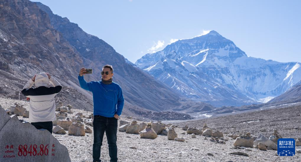 12月14日,游客在珠穆朗瑪峰高程測量紀念碑旁拍照留念。新華社記者 丁增尼達 攝