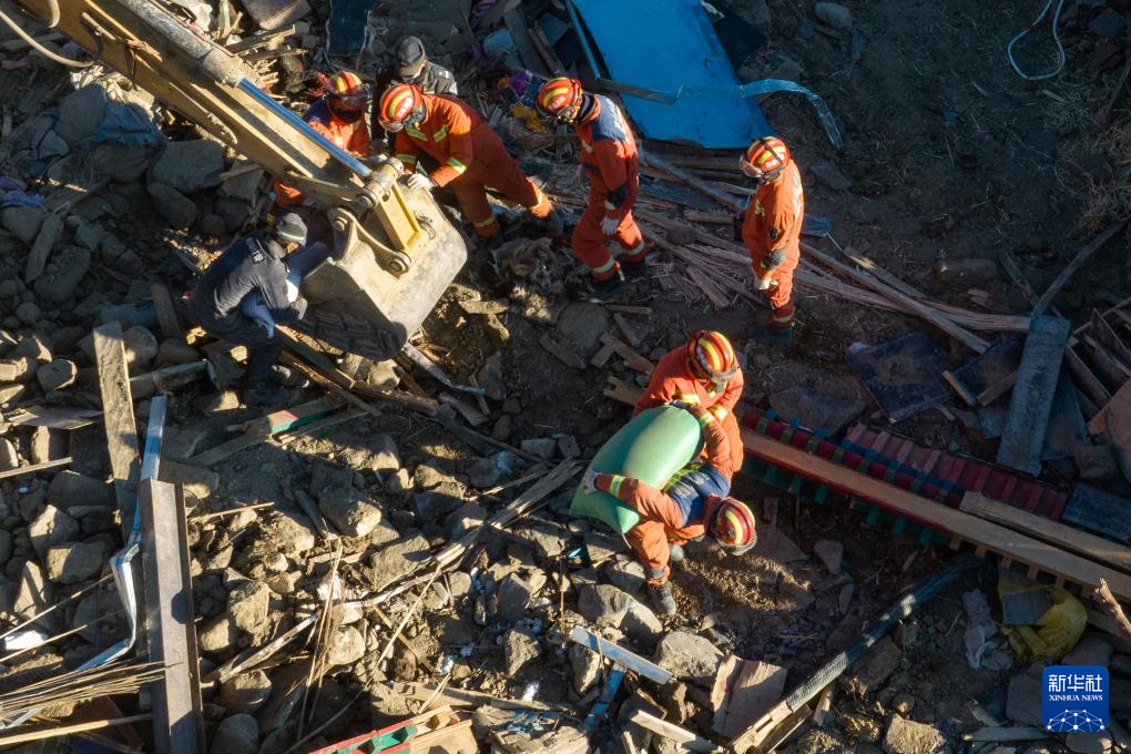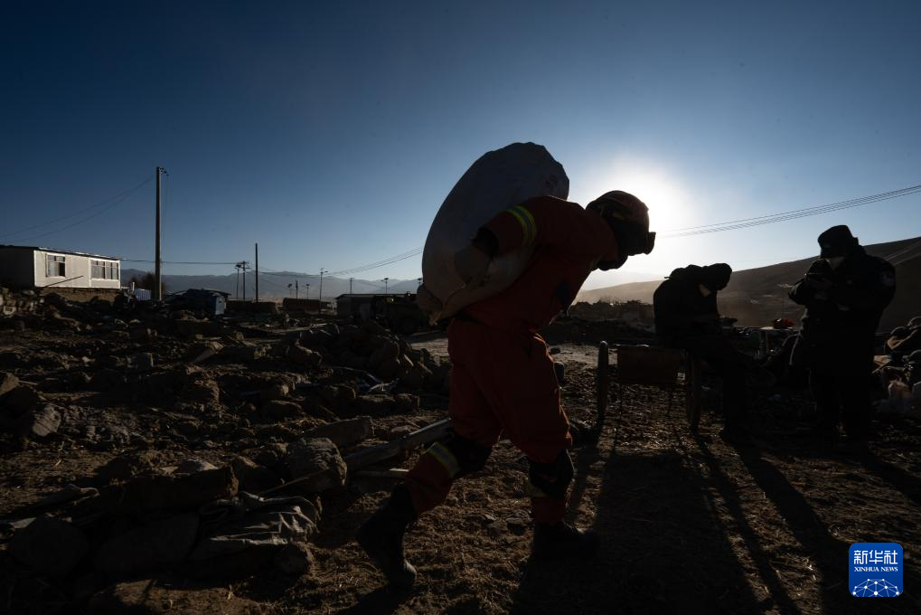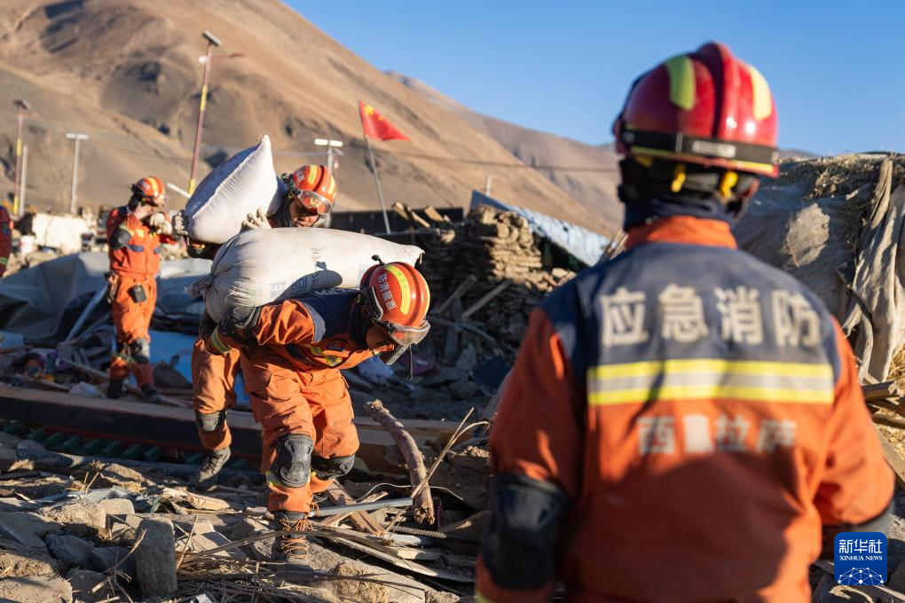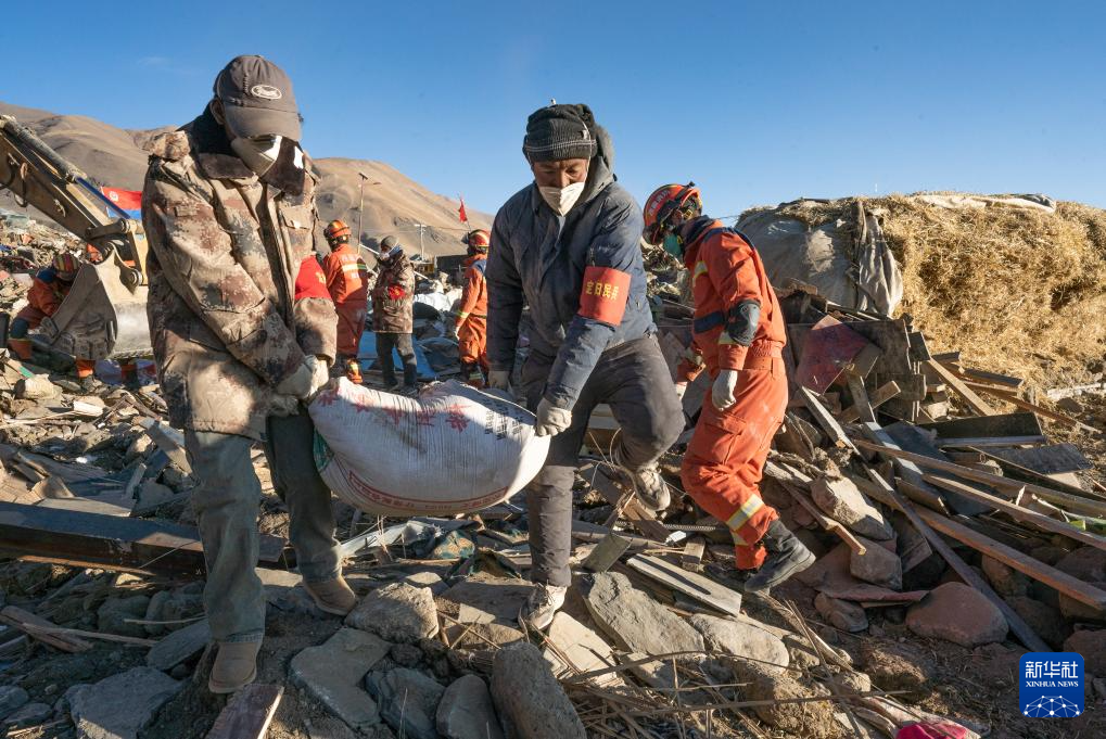 1月13日,在定日縣長(zhǎng)所鄉(xiāng)古榮村,消防員在搬運(yùn)搶救出來的青稞。新華社記者 丁增尼達(dá) 攝