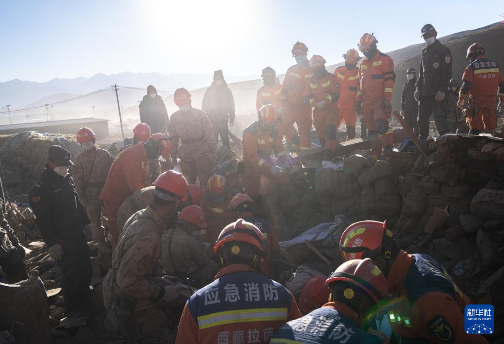 1月13日,在定日縣長(zhǎng)所鄉(xiāng)古榮村,消防員、武警官兵和公安干警在搜尋次仁扎西老人家里的青稞。新華社記者 丁增尼達(dá) 攝