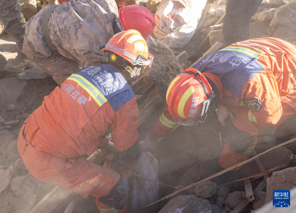 1月13日,在定日縣長(zhǎng)所鄉(xiāng)古榮村,消防員在搜尋次仁扎西老人家里的青稞。新華社記者 丁增尼達(dá) 攝