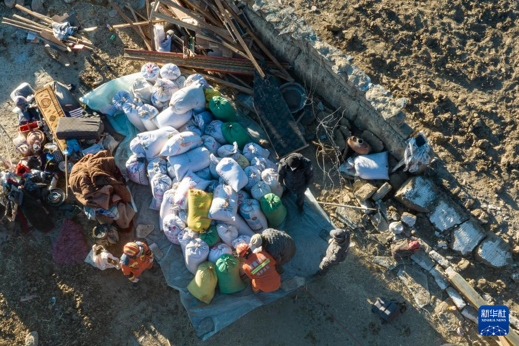 1月13日,在定日縣長(zhǎng)所鄉(xiāng)古榮村,搶救出的70多袋青稞堆放在角落(無人機(jī)照片)。新華社記者 丁增尼達(dá) 攝