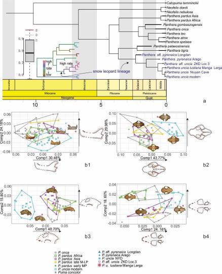 江左其杲指出,結(jié)合DNA序列和形態(tài)學(xué)數(shù)據(jù),研究團(tuán)隊(duì)推斷豹屬的系統(tǒng)發(fā)育,支持5例化石記錄的確屬于現(xiàn)生雪豹支系,且它們相對現(xiàn)生雪豹組成并系群,表明這些青藏高原之外的雪豹并非獨(dú)立于現(xiàn)生雪豹的一個分支,而是不斷從雪豹主干上分出的小分支,說明它們很有可能代表雪豹多次在特定時間段走出青藏高原的記錄,而這些記錄共同組成了雪豹演化的幾個斷面,從而得以揭秘雪豹如何一步步特化。