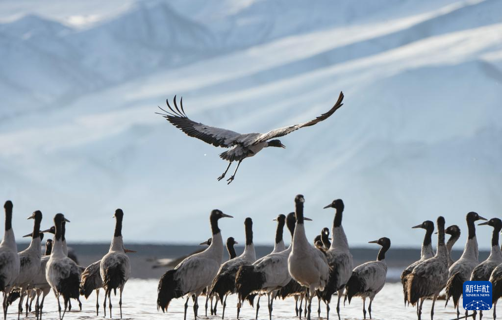 西藏自治區(qū)拉薩市林周縣平均海拔約4200米,是黑頸鶴的主要越冬地之一。一場冬雪,將林周縣虎頭山水庫染成一片銀白,黑頸鶴仿佛是這潔白舞臺優(yōu)雅的舞者。