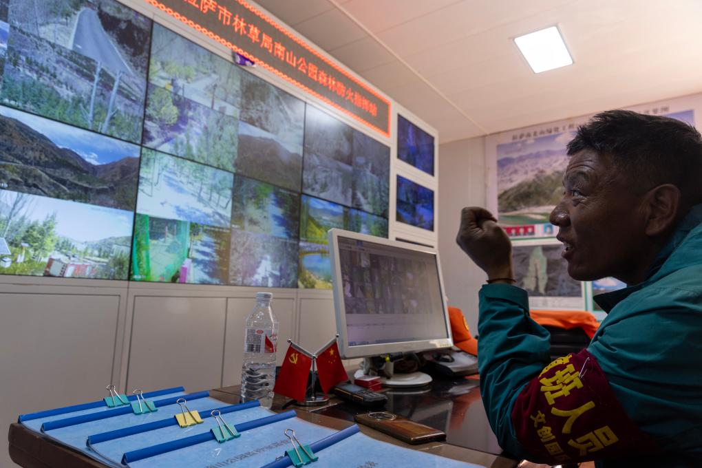 清晨,在拉薩南山公園,園區(qū)護(hù)林員扎西曲培早早來到監(jiān)控室,透過幾十個(gè)監(jiān)控畫面,注視著這片他守護(hù)了13年的山林——他不僅要監(jiān)控各處的植被情況,還要組織植樹、澆水、病蟲害防治等工作,確保樹木茁壯成長(zhǎng)。