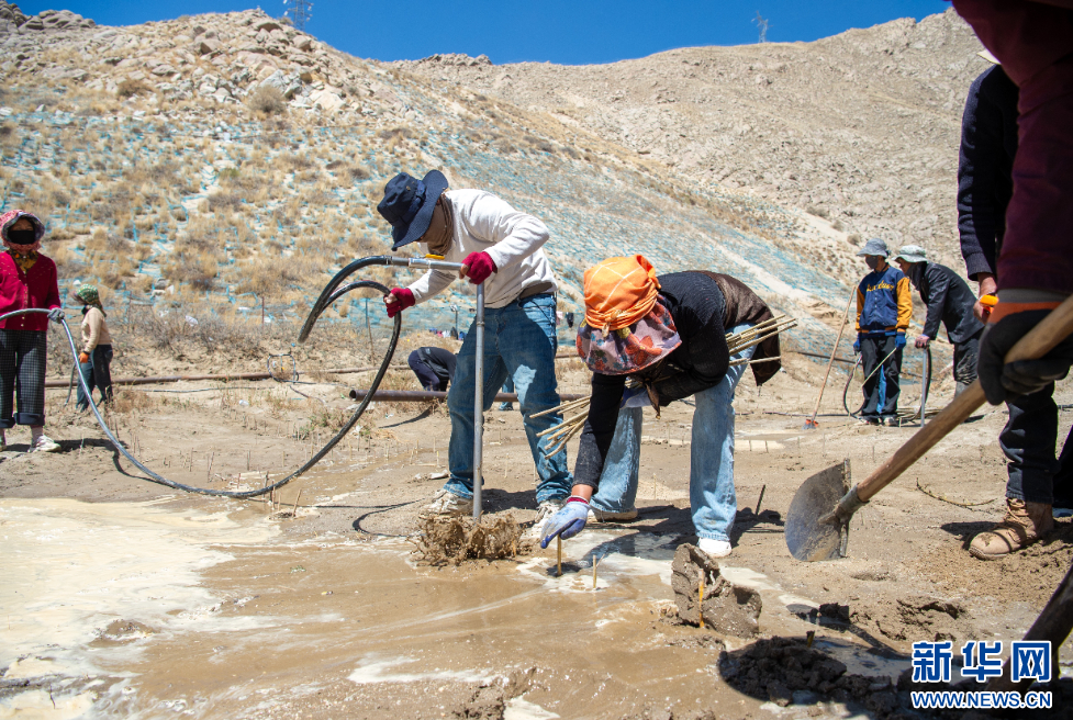 4月24日,在拉薩南北山造林綠化(貢嘎段)2號(hào)片區(qū),當(dāng)?shù)卮迕裨谠詷?。新華網(wǎng) 旦增努布 攝