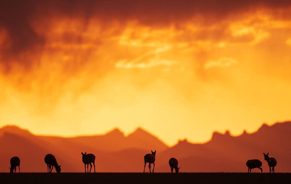 2024年6月16日,在羌塘國家級自然保護區(qū)境內的西藏那曲市申扎縣買巴鄉(xiāng)魯確塘草原上,待產的藏羚羊沐浴在晚霞中。新華社記者費茂華攝