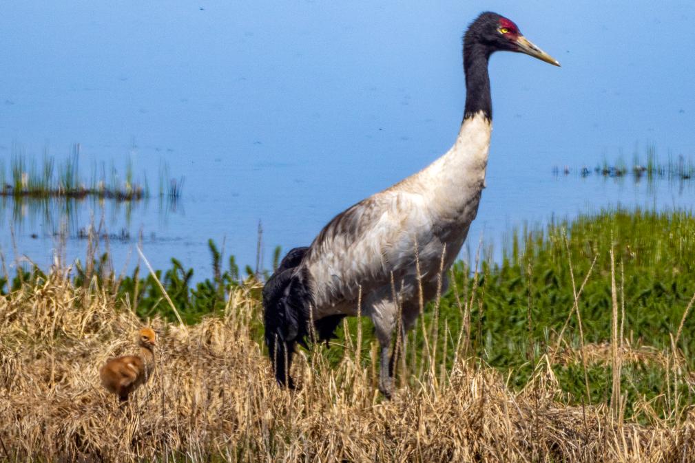一只黑頸鶴在西藏那曲市申扎縣的申扎藏布濕地上照顧出殼一周的雛鳥(6月11日攝)。 新華社記者 黃耀漫 攝