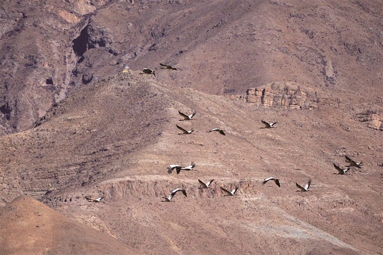 每年10月至次年4月,黑頸鶴遷徙至拉薩越冬。林周縣因其獨特的濕地與耕地資源,成為黑頸鶴的核心棲息地。每年11月底至12月,黑頸鶴陸續(xù)集結(jié)于此。近三年,越冬的黑頸鶴數(shù)量穩(wěn)定在1600至2300只,占拉薩越冬黑頸鶴總數(shù)的近六成。