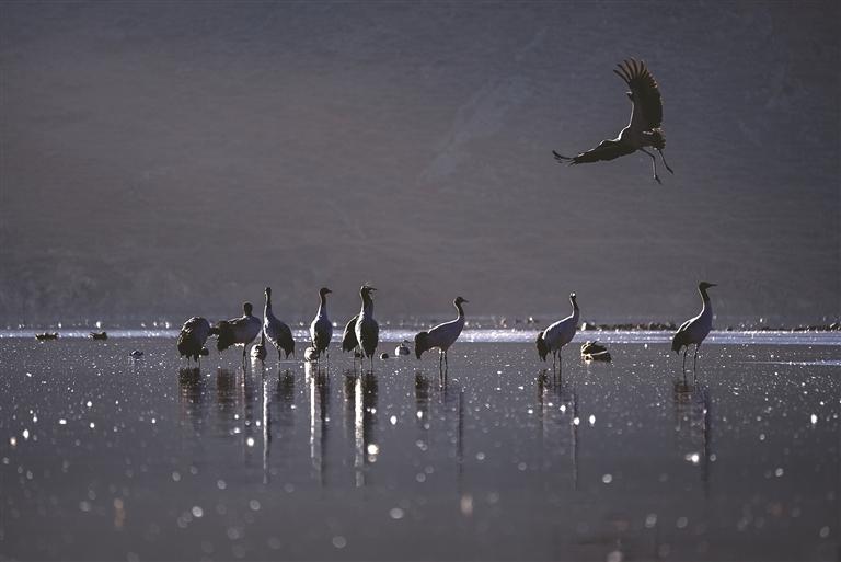 來(lái)到卡孜水庫(kù),只見(jiàn)水面上薄霧未散,黑頸鶴的鳴叫聲劃破靜謐,那聲音清亮卻不刺耳,像帶著高原特有的通透感,時(shí)而短促清脆伴著水波蕩漾的輕響,似乎在訴說(shuō)著高原的故事。循聲望去,幾只黑頸鶴正在湖面上悠然佇立,修長(zhǎng)的脖頸微微彎曲,倒映在平靜的水面上,宛如水墨畫卷中的靈動(dòng)筆觸;忽然間,幾只黑頸鶴率先舒展雙翼,寬大的翅膀劃破晨霧,腳掌蹬離水面時(shí)濺起細(xì)碎的水花,身姿矯健地朝著高空飛去,其余黑頸鶴也相繼展翅,追隨同伴的身影扶搖而上,朝著村落方向飛去。當(dāng)它們從錯(cuò)落有致的村民住房上空掠過(guò)時(shí),晨光恰好穿透薄霧,灑在灰褐色的羽翼上,下方屋頂升起裊裊炊煙,動(dòng)靜之間,勾勒出一幅人與自然和諧共生的鮮活圖景。