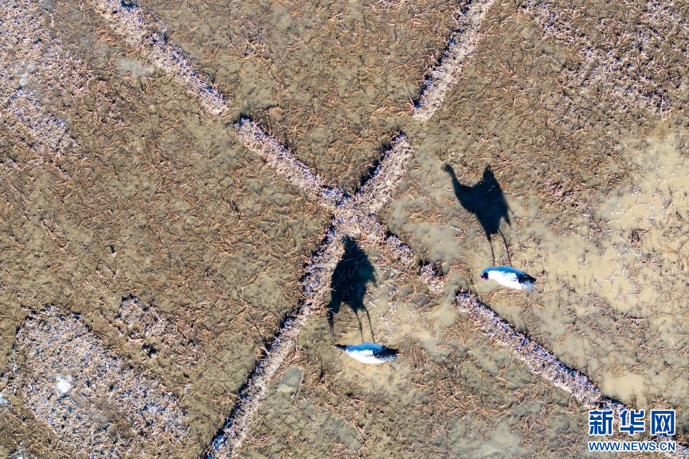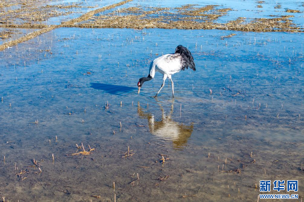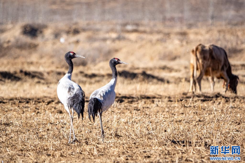 12月18日,在西藏日喀則市南木林縣田間覓食的黑頸鶴。新華網(wǎng) 旦增努布 攝