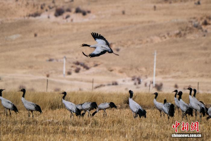 2月8日,一群越冬黑頸鶴飛過拉薩市林周縣春堆鄉(xiāng)卡東村上空。中新社記者 江飛波 攝