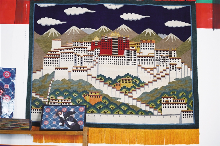 在藏毯廠陳列廳里,懸掛著一幅以布達拉宮為題材的藏毯?!把矍暗倪@幅藏毯已經(jīng)懸掛十年,沒有任何變形?!笨ν邎圆靥簭S工作人員彭志紅說,可見手工藏毯的質(zhì)量絕佳。