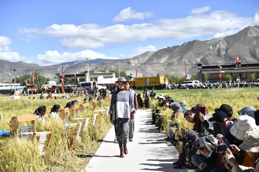 田野間,新開辟出的一條上百米的S形秀道婉轉綿延。隨著富有節(jié)奏感的音樂響起,身著氆氌藏族服飾的模特款款走來,一旁,30位藏族“阿佳”坐在編織機前熟練地捻織著氆氌手工品。