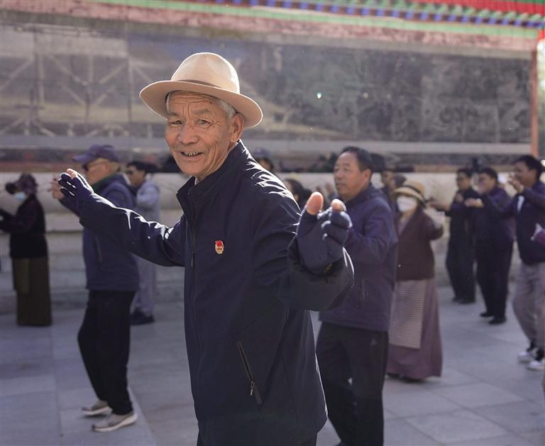 歡樂的鍋莊、悠揚的朗瑪堆諧、節(jié)奏輕快的健身操……每天早晨,拉薩宗角祿康公園內(nèi)總是人聲鼎沸、熱鬧非凡,在公園的各處遮陽棚下聚集了不少老年人,他們身著特色藏裝,隨著音樂的節(jié)奏,整齊劃一地跳著鍋莊舞,每個人的臉上洋溢著幸福的笑容,載歌載舞的身影、和藹可親的笑臉共同映照著他們幸福的晚年生活。
