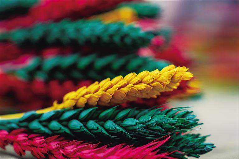 從春耕、夏耘、秋收到冬天的染色、晾干、捆綁、售賣,“羅薩梅朵”的制作過程并不簡單,種植和上色都極其辛苦。卓瑪次仁告訴記者:“每年4月,我們開始種植小麥和青稞,澆水施肥。9月收割時,我們會挑選顆粒飽滿的麥穗和青稞穗,捆綁后去皮曬干。10月,將它們收入屋中,一層層壘起來,房間最好朝陽且沒有老鼠。11月,開始采購顏料和捆扎用的毛線?!?/p>