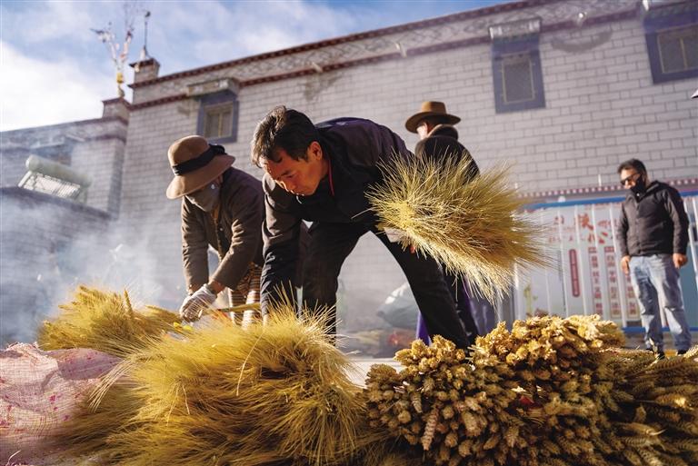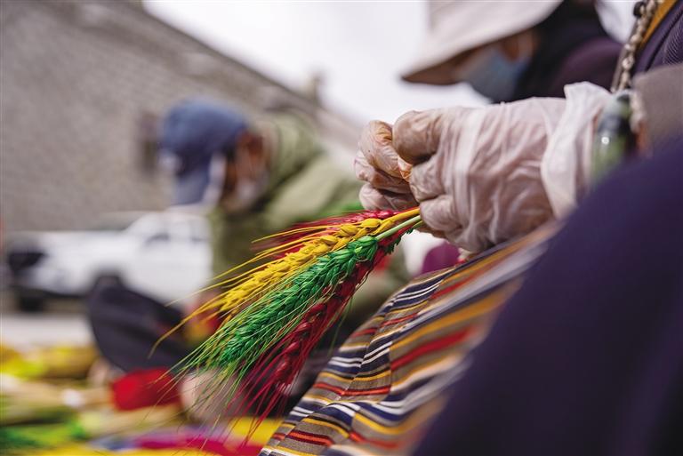 走進(jìn)桑木村,房屋錯落有致,廣場上,村民們在冬日暖陽下忙碌著。有的正在煮顏料為麥穗和青稞穗上色,有的正在捆綁曬干的“羅薩梅朵”?!盀榱朔奖阒谱鳎覀兏鶕?jù)外形給這些麥穗和青稞穗起了名字,比如這個禿禿的叫‘古日’,這個最長的叫‘扎日’,還有‘阿索’和‘梅朵’。”64歲的村民其米卓嘎與幾位姐妹圍坐在一起,一邊捆綁“羅薩梅朵”,一邊笑著向記者介紹,手上動作絲毫未停?!昂芏嗳诉^年講究儀式感,會選擇買齊這四種,但大部分人會從中選兩種?!?/p>