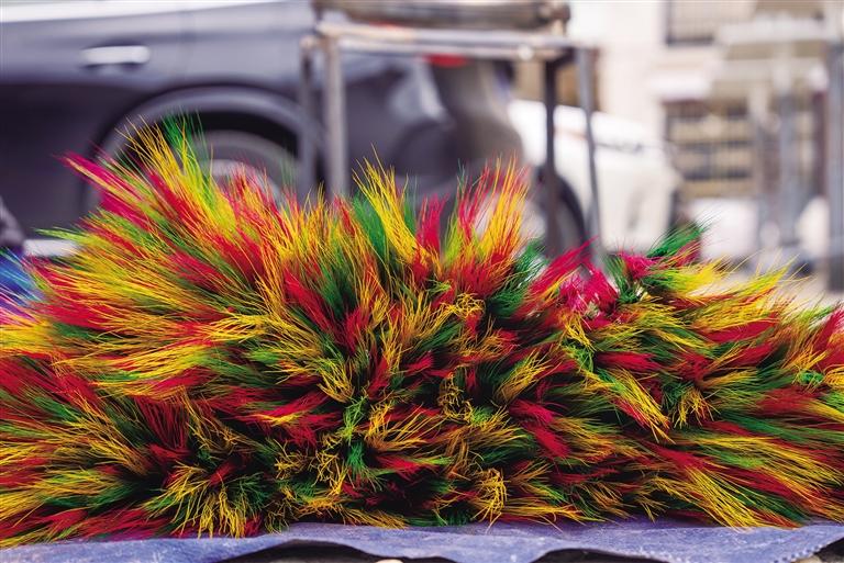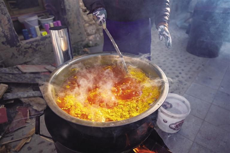 從金黃到色彩斑斕,“羅薩梅朵”的制作需要經(jīng)過收割、曬干、上色等數(shù)道工序,這是桑木村村民傳承至今的手藝。熱氣騰騰的顏料鍋旁,年輕的媳婦正在煮顏料;曬干的“羅薩梅朵”堆在一旁,一位奶奶和她的孫子正在有序捆綁。廣場上,年齡最大的村民近70歲,最小的12歲,年輕人從老一輩手中接過了文化傳承的接力棒。