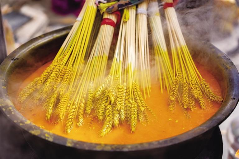 起灶、燒水……麥穗和青稞穗曬干后,就要開始上色。卓瑪次仁將顏料倒入開水中不斷攪拌,防止結(jié)塊。隨后,她將麥穗和青稞穗放入其中,反復(fù)浸泡、拿出,再浸泡、再拿出。幾遍之后,再將上好色的麥穗和青稞穗曬干、捆綁起來售賣。“顏料要反復(fù)調(diào)試,上色前先拿一根試色,確定成色完好后,再把一整束放進(jìn)去反復(fù)煮。這個步驟看似簡單,但需要耐心和細(xì)心。”卓瑪次仁手中的麥穗從金黃慢慢變成玫紅色。
