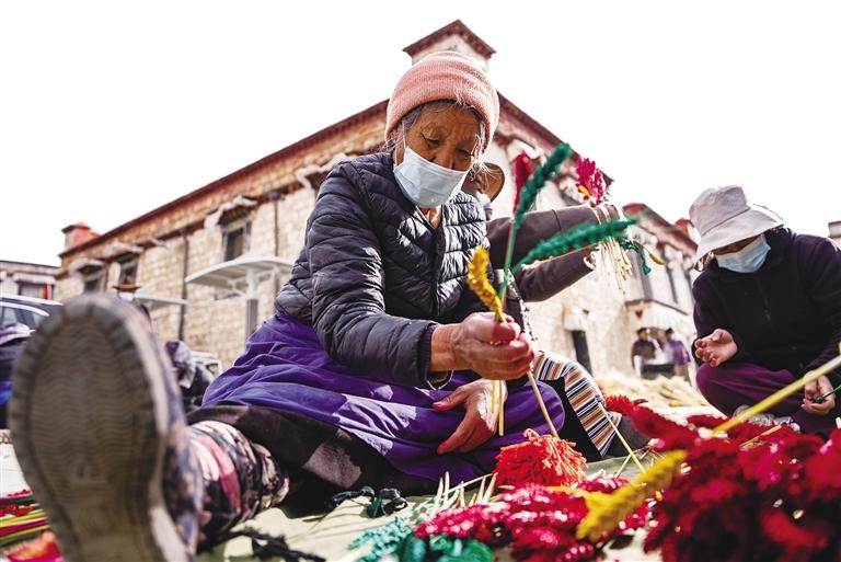 以前,高原植被稀疏,冬日里鮮花更是罕見。人們制作“羅薩梅朵”,讓這一束束“人造的花朵”盛開在冬日的高原上,這體現(xiàn)了西藏群眾對美好生活的熱愛和追求。正如央金所說,隨著西藏群眾物質(zhì)生活水平的提高,色彩越來越鮮艷、品質(zhì)越來越高的“羅薩梅朵”,正是西藏群眾多姿多彩幸福生活的絕佳體現(xiàn)。
