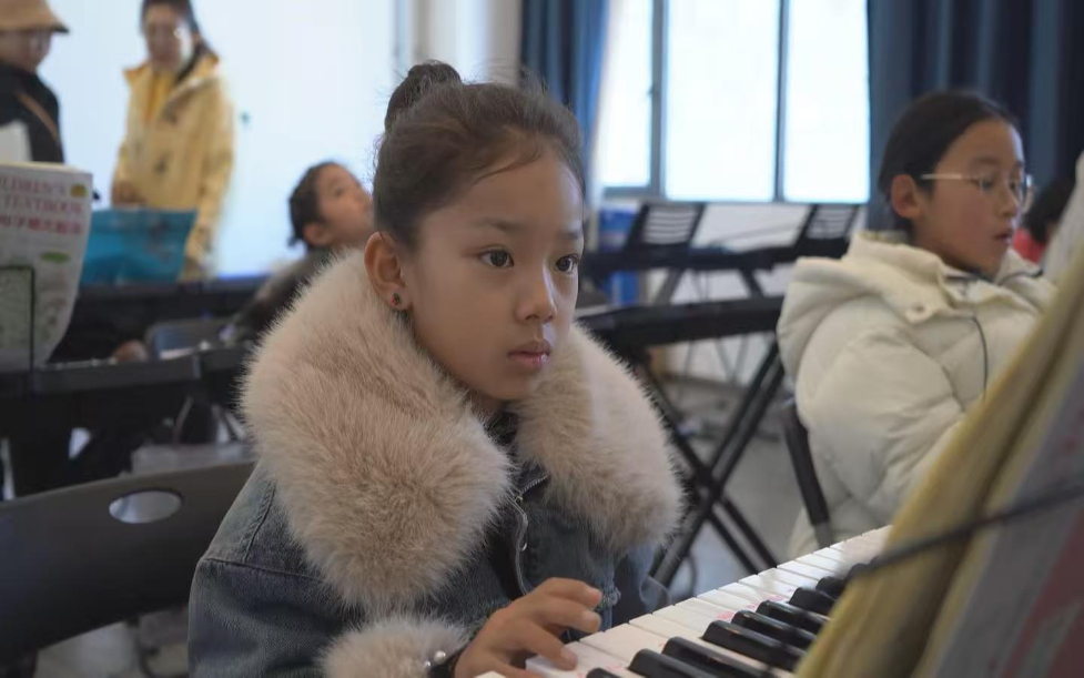 15日,一名孩童在西藏青少年興趣培訓(xùn)班學(xué)習(xí)彈奏鋼琴。(西藏青少年實踐教育基地供圖)