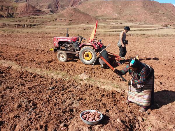 在充分調研的基礎上,嘎瑪澤加從本村實際出發(fā),積極爭取項目、資金支持,于2014年起牽頭在全村推廣紅土豆和藍青稞特色產(chǎn)業(yè)種植工作。經(jīng)過不斷努力,成功將覺恩村紅土豆種植面積擴大到1200畝、藍青稞1000畝,這兩項種植業(yè)每年為群眾創(chuàng)收430萬元,使群眾看到了發(fā)展特色種植產(chǎn)業(yè)帶來的實實在在的經(jīng)濟效益。