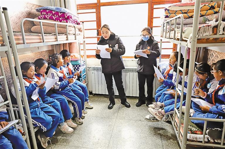 圖為措美縣人民法院工作人員在措美縣小學學生宿舍向?qū)W生普及法律知識。 記者 巴桑旺姆 攝