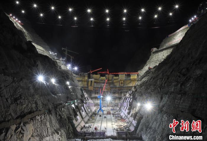 葉巴灘水電站大壩夜晚未間斷施工。王磊 攝