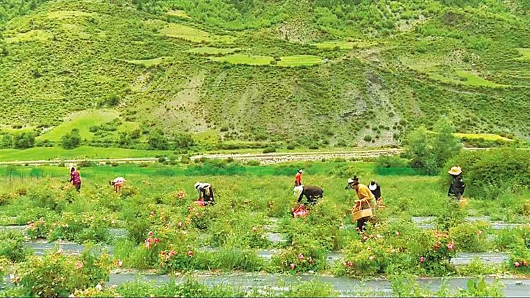 桑多鄉(xiāng)桑多村群眾在村集體經(jīng)濟產(chǎn)業(yè)——云朵玫瑰基地采摘作業(yè)。記者 平措郎加 攝