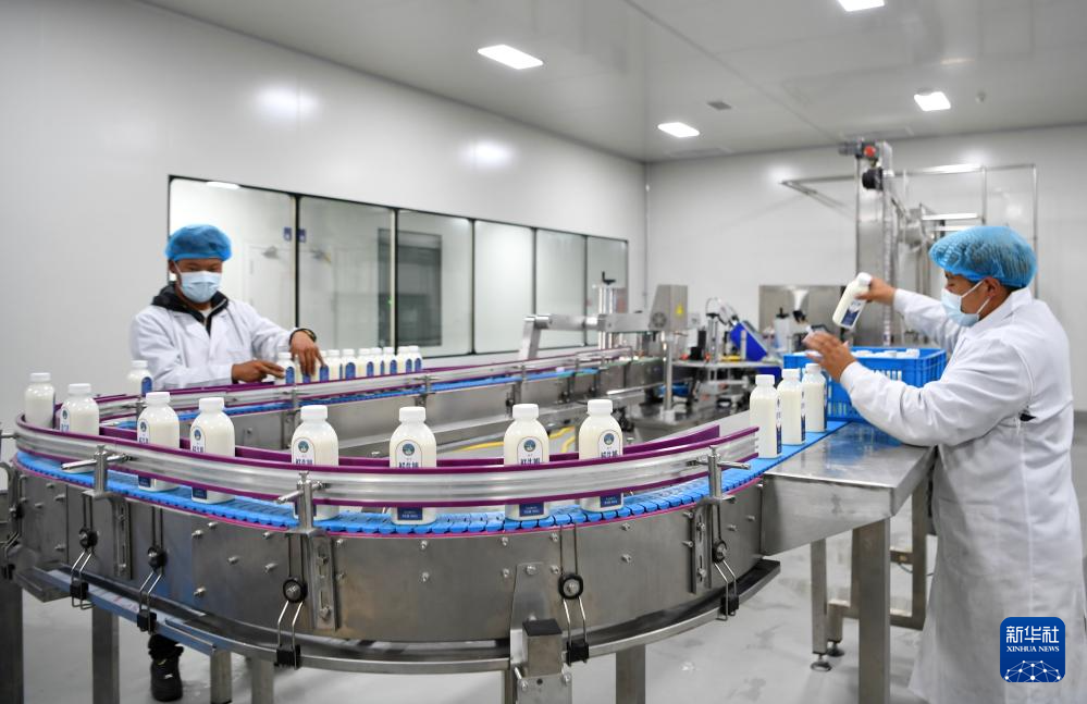 嘎確生態(tài)畜牧業(yè)發(fā)展有限責(zé)任公司的工人在牛奶生產(chǎn)流水線上工作(8月24日攝)。新華社記者 張汝鋒 攝