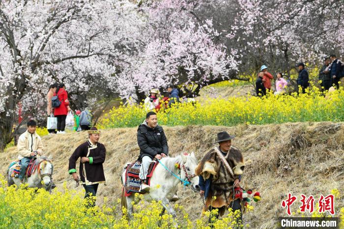 圖為2024年3月31日林芝桃花節(jié)期間,嘎拉村村民帶領游客騎馬賞花。貢嘎來松 攝