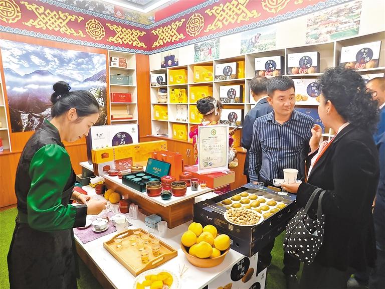 察隅縣供銷合作社工作人員在林芝城市會(huì)客廳內(nèi)展示農(nóng)特產(chǎn)品薏仁。