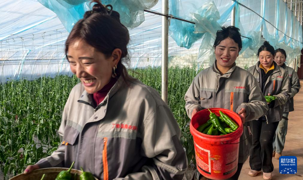 11月22日,在丁青縣農(nóng)業(yè)生態(tài)產(chǎn)業(yè)園,工作人員搬運采摘的辣椒。新華社記者 普布次仁 攝