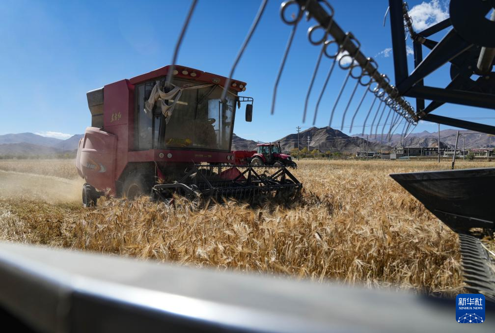 西藏日喀則市江孜縣江熱鄉(xiāng)班覺(jué)倫布村農(nóng)機(jī)服務(wù)農(nóng)民專業(yè)合作社的社員使用農(nóng)機(jī)收獲青稞(10月16日攝)。新華社記者 晉美多吉 攝