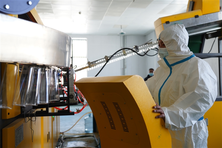 霞崗江實(shí)業(yè)公司工作人員操作飲用水產(chǎn)品包裝設(shè)備。記者 洛桑旦增 達(dá)珍 攝