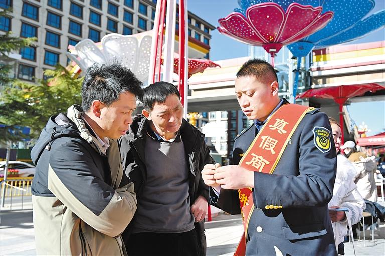 圖為桑珠孜區(qū)市場監(jiān)管局投訴舉報中心負責(zé)人李良友(右)向市民講解商品真假辨別方法。記者 扎西頓珠 攝