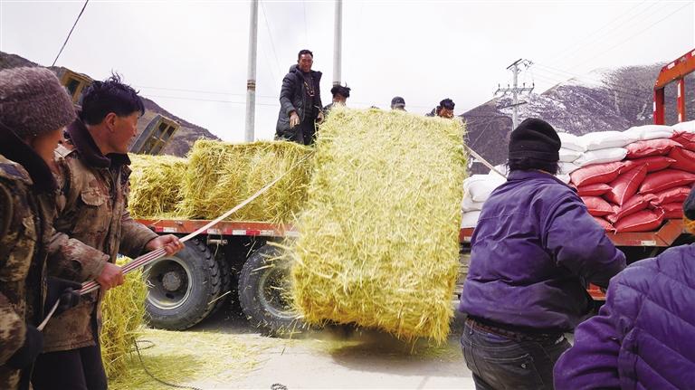3月18日清晨,細碎的雪花如柳絮般輕柔飄落,墨竹工卡縣門巴鄉(xiāng)覆上了一層銀裝。門巴鄉(xiāng)巴爾卡村委會的院子里一片熱火朝天的景象,一袋袋飼草料和化肥整整齊齊地堆放在院子里,有的騎著摩托車,有的開著拖拉機,大家的臉上都洋溢著幸福的笑容,滿心期待著物資發(fā)放。