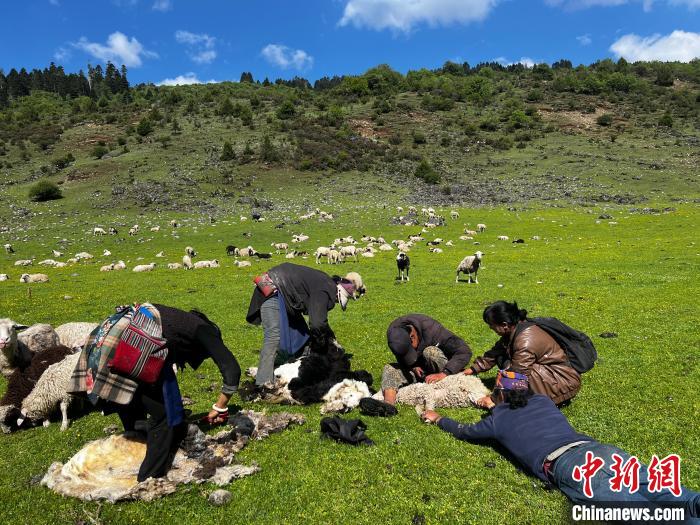 阿木姐弟(右二、右三)加入到剪羊毛的隊(duì)伍。時文枝 攝
